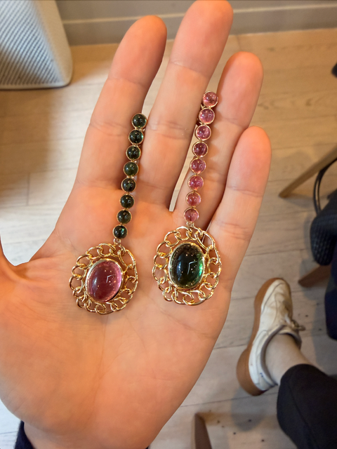 These striking drops began as simple stud earrings. Robin wanted to transform them into true showstoppers, so we reimagined the design by adding cascading vertical lines of pink and green tourmaline cabochons, set in 14K yellow gold. The added length and fluid movement elevate the original studs into bold statement drops — expressive, colorful, and designed to make an entrance.
